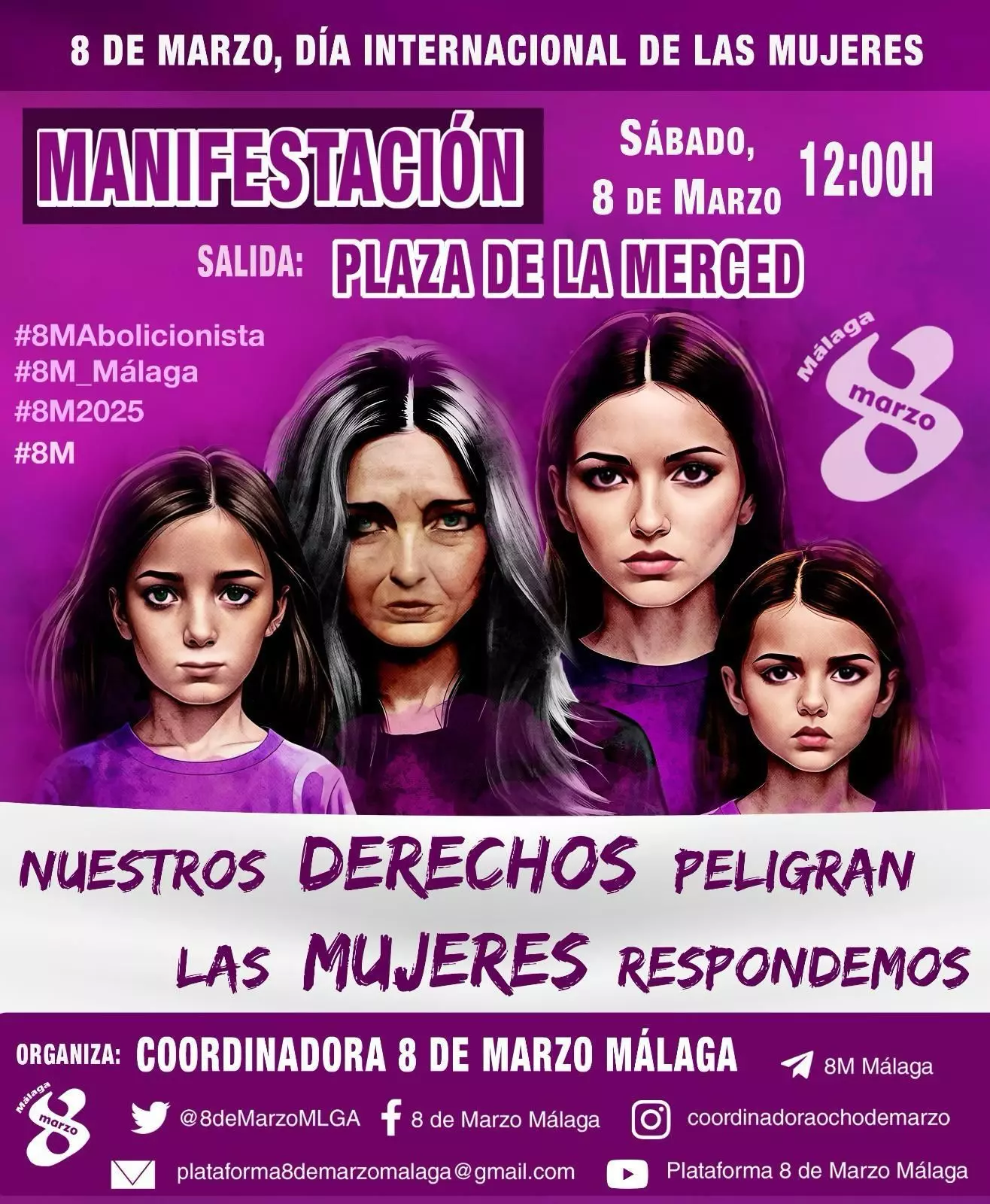 Así, hacemos alguna recopilación de los eventos que se van a celebrar estos días. El epicentro será este sábado 8 a partir de las 12.00 horas con la manifestación por la igualdad y por la mujer. Está previsto que comience en torno a las 12.00 horas desde la Plaza de la Merced. Y lo hará bajo el lema «Nuestros derechos peligran, las mujeres respondemos».