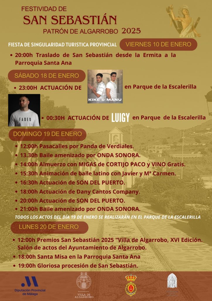 ⁣En este 2025 se celebra el domingo 19 y lunes 20 de enero. Habrá pasacalles con verdiales y la participación de la Banda Municipal, misa en honor a San Sebastián, procesión del santo por las calles del pueblo, conciertos y espectáculos para toda la familia, migas y vino gratis, fuegos artificiales y mucha música.