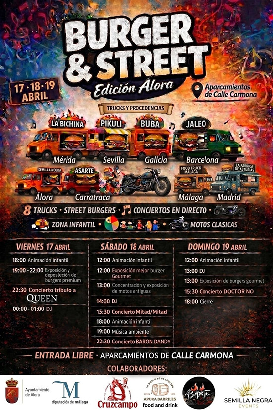 Llega a Álora este fin de semana del viernes 17 al domingo 19 de abril una nueva edición de «Burger & Street», un evento en el que numerosos food-trucks especializados en hamburguesas traerán sabores de diferentes partes de España. Será una gran celebración de la cultura burger, donde cada asistente podrá descubrir nuevos sabores, comparar propuestas y elegir su favorita entre distintas hamburguesas gourmet. Además habrá conciertos en directo, animación infantil, y exposición de motos clásicas.