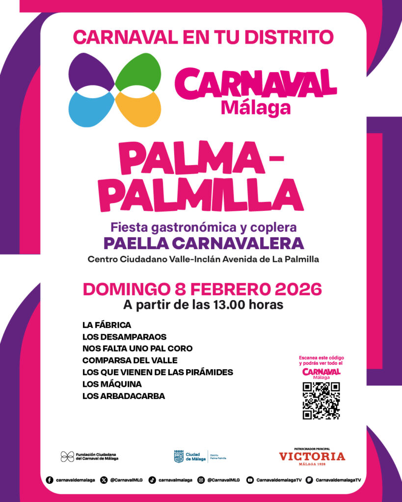 El domingo 8 de febrero, a partir de las 13:00 horas, el Centro Ciudadano Valle-Inclán (avenida de La Palmilla) acoge la paella carnavalera, una fiesta gastronómica y coplera enmarcada en el Carnaval de Málaga.