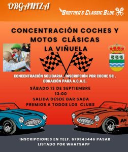 Llega una iniciativa automovilística que se desarrollará en La Viñuela en dos jornadas, domingo 7 y sábado 13 de septiembre. La Viñuela será el escenario tanto de la ruta que tendrá lugar este domingo como de la concentración solidaria que tendrá lugar el próximo sábado 13, sumando alicientes a la Feria de la Pasa que tendrá lugar ese mismo día.