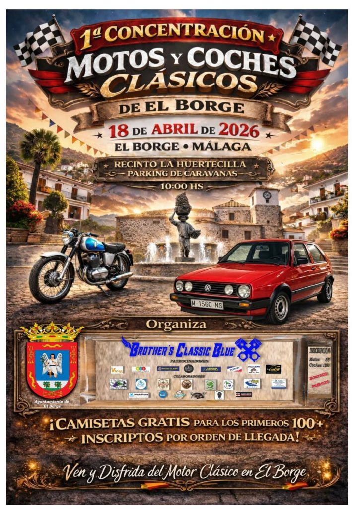 El municipio de El Borge acogerá este sábado, 18 de abril, la primera concentración de motos y coches clásicos, una cita pensada para los amantes del motor y para todos aquellos que quieran disfrutar de una jornada diferente en un entorno único de la Axarquía malagueña.