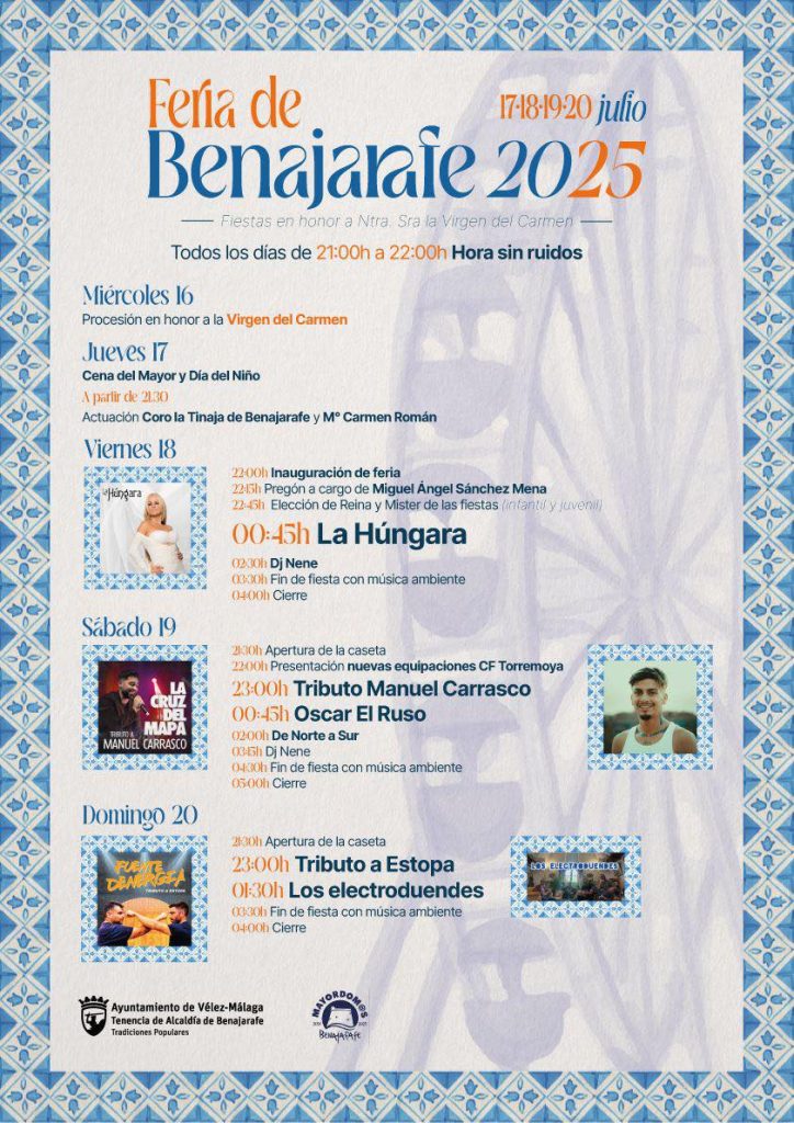 Con la llegada de julio, Benajarafe se prepara para vivir, una vez más, su tradicional y esperada Feria en honor a Nuestra Señora la Virgen del Carmen. Los vecinos y visitantes disfrutarán, desde el 17 al 20 de julio, de una variada y extensa velada, ideada para todos los públicos y con actuaciones de gran calibre, destacando ‘La Húngara’, artista con excelente reconocimiento provincial y nacional, que ha sido durante años y sigue siendo un sinónimo de espectáculo y lleno absoluto allá por donde vaya, y Óscar El Ruso, un talento en auge muy seguido por los más jóvenes.