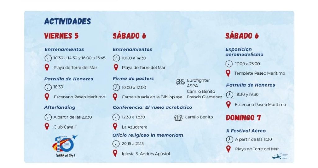 Además, el sábado 06 de septiembre, a las 20:00 horas, en la Iglesia de San Andrés Apóstol de Torre del Mar, se oficiará una misa como homenaje a los pilotos caídos que han participado en nuestros festivales aéreos a lo largo de estos años.