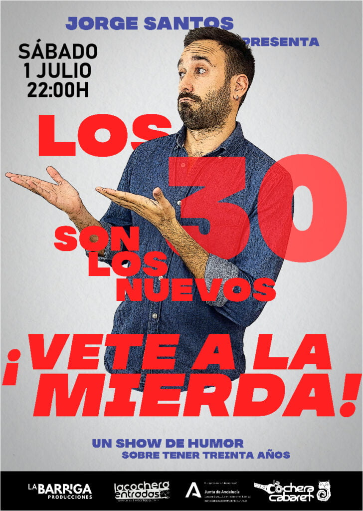 Este sábado 1 de julio llega a La Cochera Cabaret el humorista Jorge Santos con su monólogo ‘Los 30 son los nuevos… ¡Vete a la mierda!’ a partir de las 22 horas.