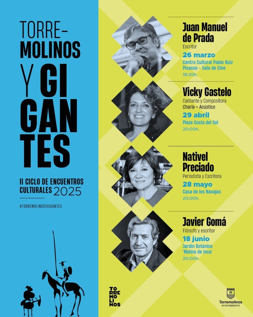 El Ayuntamiento de Torremolinos ha presentado un avance de la programación de ‘Torremolinos y Gigantes’, el ciclo cultural que organiza encuentros con artistas, creadores e intelectuales en diferentes espacios del municipio. La agenda para los próximos meses, adelantada por la alcaldesa, Margarita del Cid, y el concejal de Cultura, José Manuel Ruiz Rivas, incluye citas con el escritor Juan Manuel de Prada, la cantante Vicky Gastelo, la periodista Nativel Preciado y el filósofo Javier Gomá.