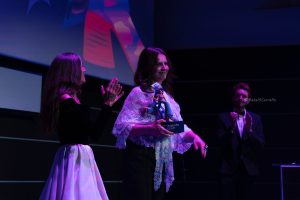 Previamente, la organización le mostraba las proyecciones de dos videos de cineastas que, a pesar de no haber podido asistir, no querían perder la oportunidad de mandarle un cariñoso saludo a la actriz; Rodrigo Sorogoyen, e Isabel Coixet.