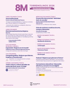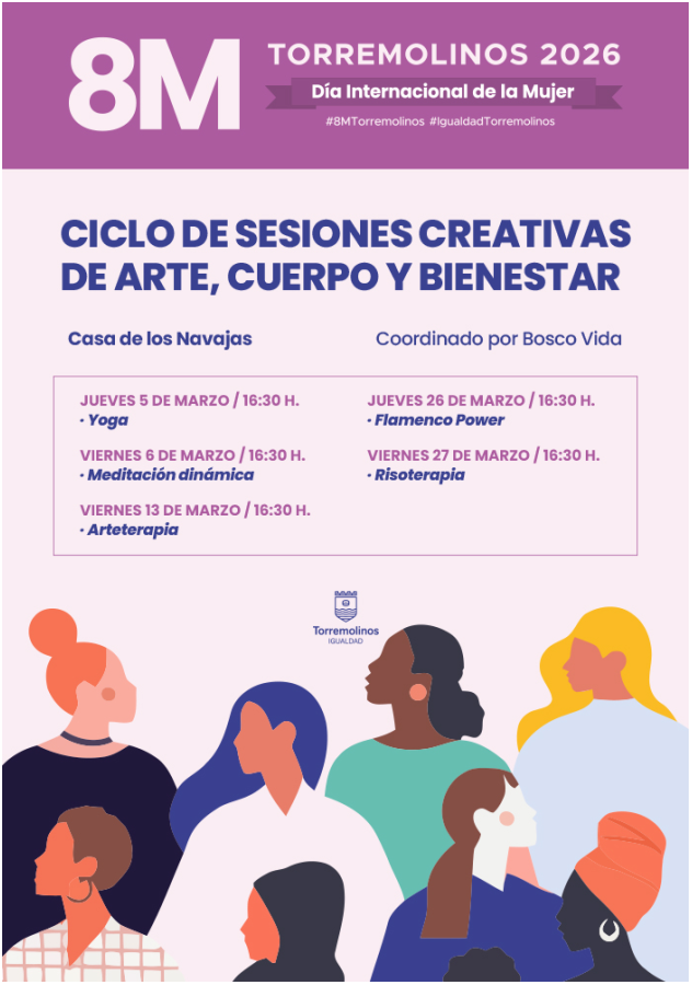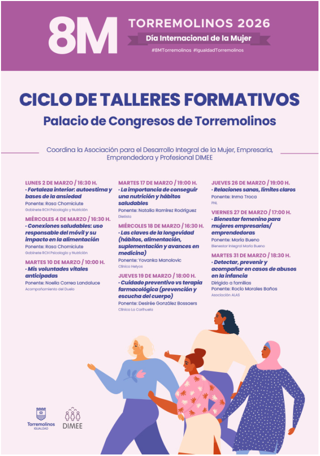 El amplio programa de actividades incluye otras de interés como un ciclo de sesiones creativas de arte, cuerpo y bienestar, a cargo de Bosco Vida, Formaciones educativas ‘Educación afectiva y sexual en la era digital’ dirigidas al profesorado de los centros educativos del municipio y AMPAS, o un Ciclo de Talleres Formativos, coordinados por DIMEE, que tendrán lugar a lo largo del mes de marzo en el Palacio de Congresos de Torremolinos y abordarán temas como la autoestima, la salud, el bienestar femenino o la prevención de abusos en la infancia.
